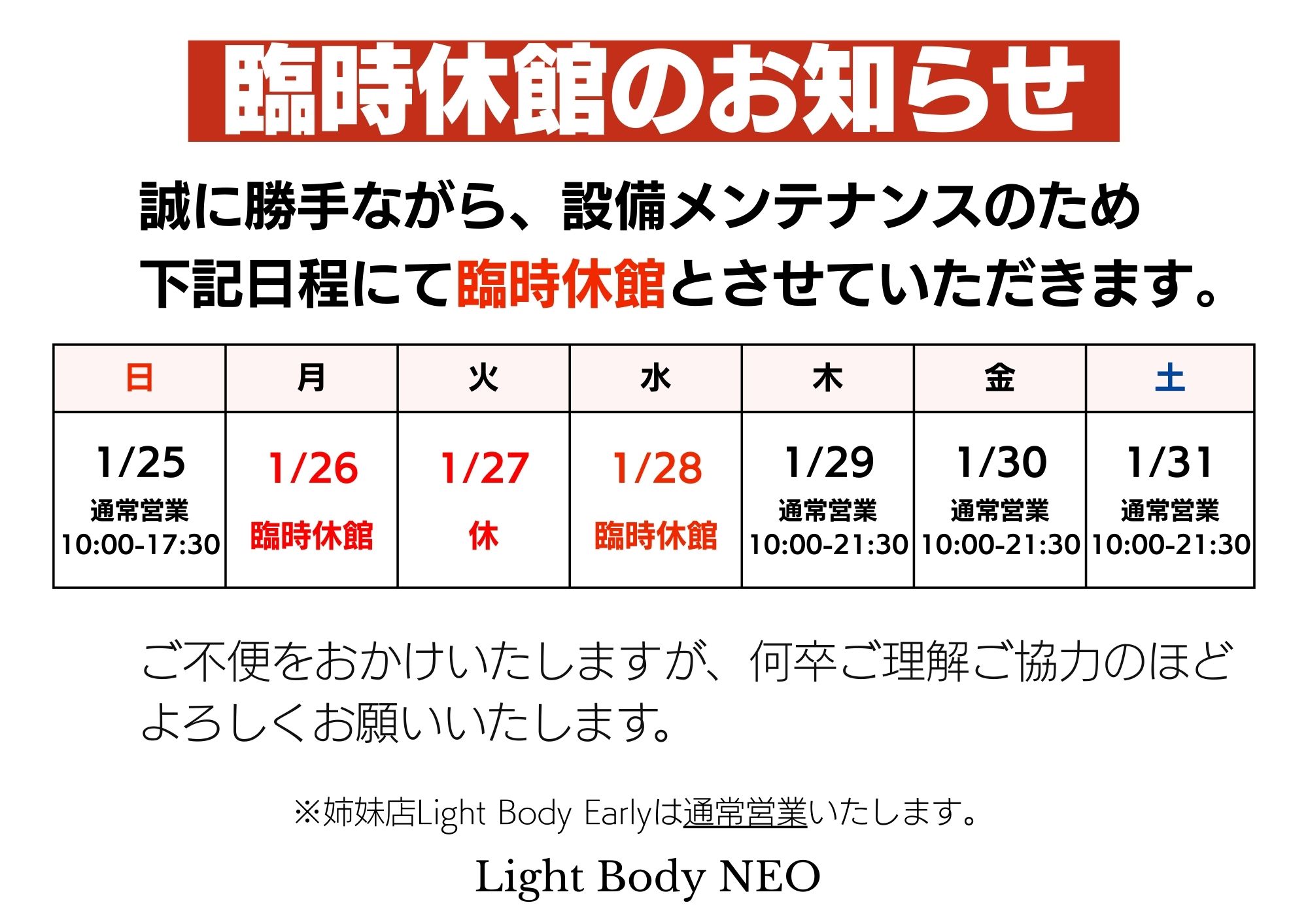 LightBodyNEO臨時休館のお知らせ 1/26~1/28